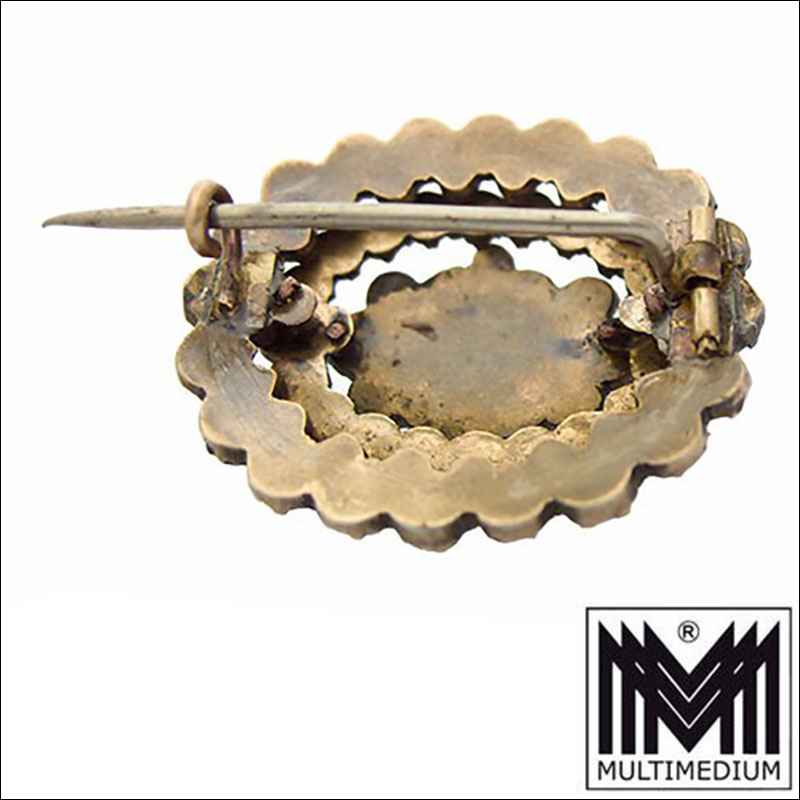 The reverse features a classic C-clasp with a long pin mechanism, typical of the 19th century.